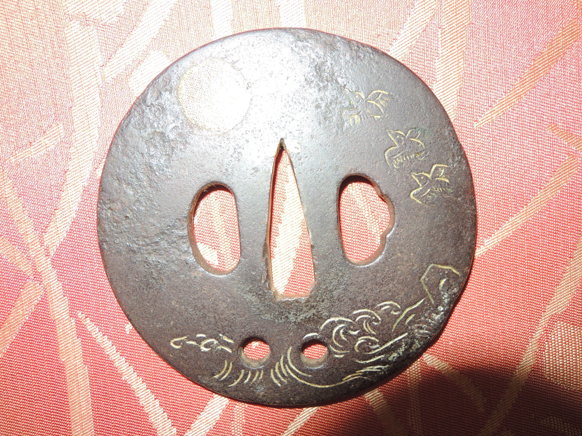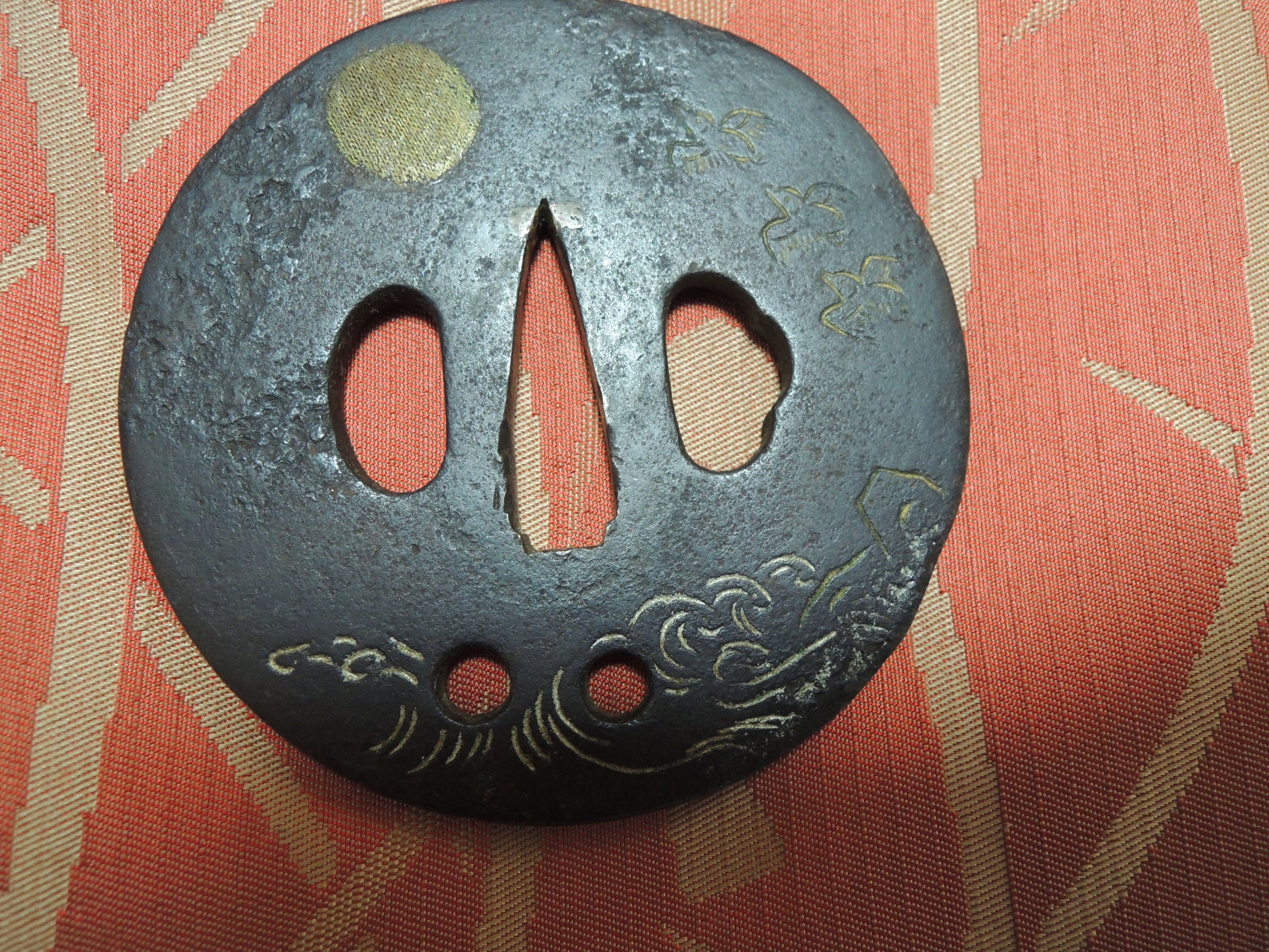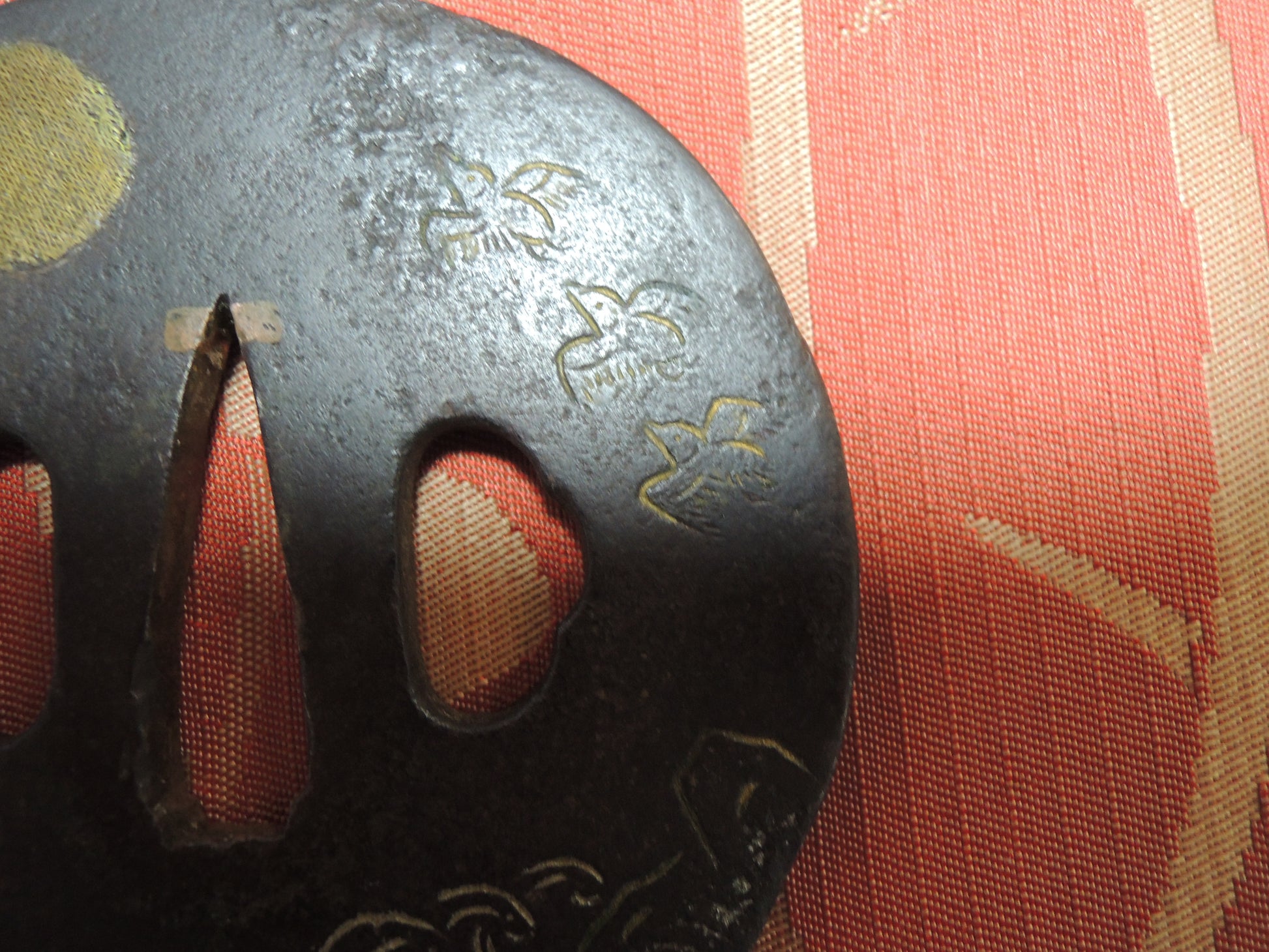 Antique Iron Tsuba Japan Samurai katana Edo period Full moon and seabirds