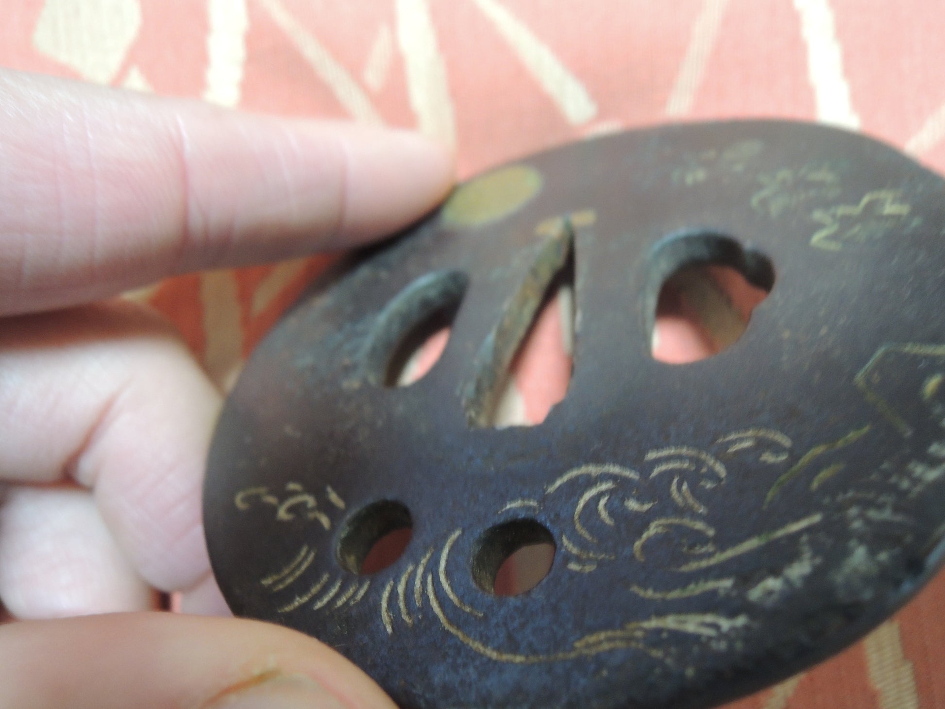 The size of the hole in the Tsuba is 32mm in length, maximum 7mm in width, and minimum 1mm.