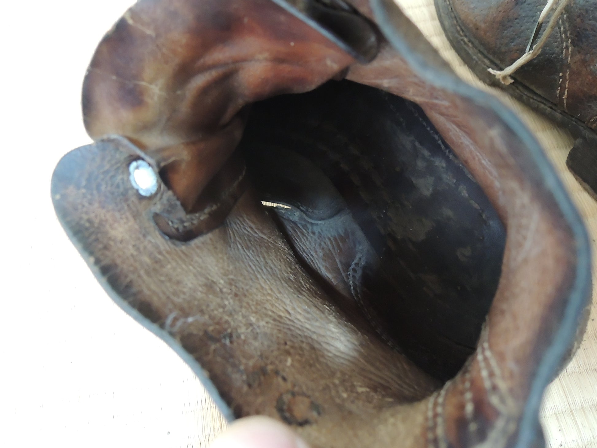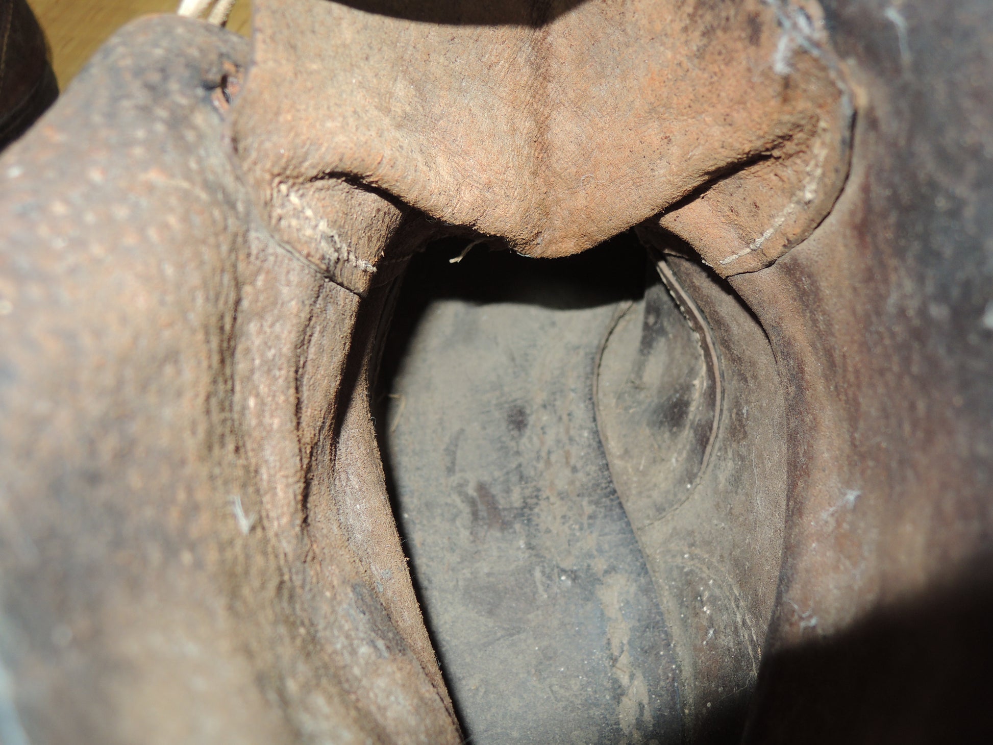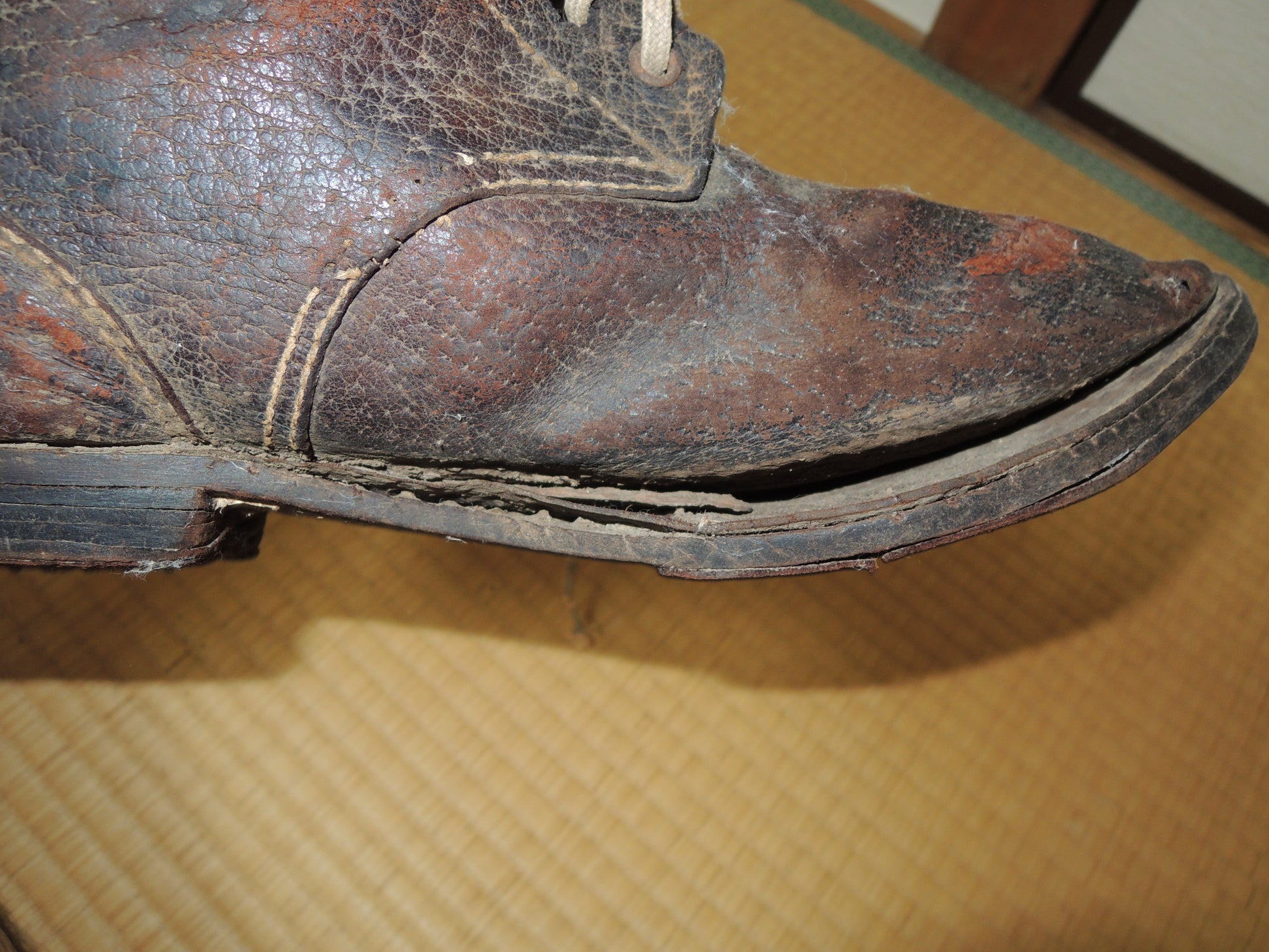 The inspection stamp on the sole of the shoe is worn and unreadable.